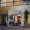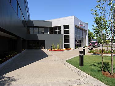 The new 5,000 sqft. aluminum-clad addition provides relief to the monotonous building behind. Inside the day-lit showroom is a full-size truck display, conference rooms, and a company store.